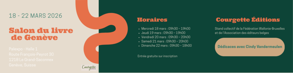 Courgette Éditions participe au Salon du livre de Genève 2026, l’un des événements littéraires majeurs de la francophonie.